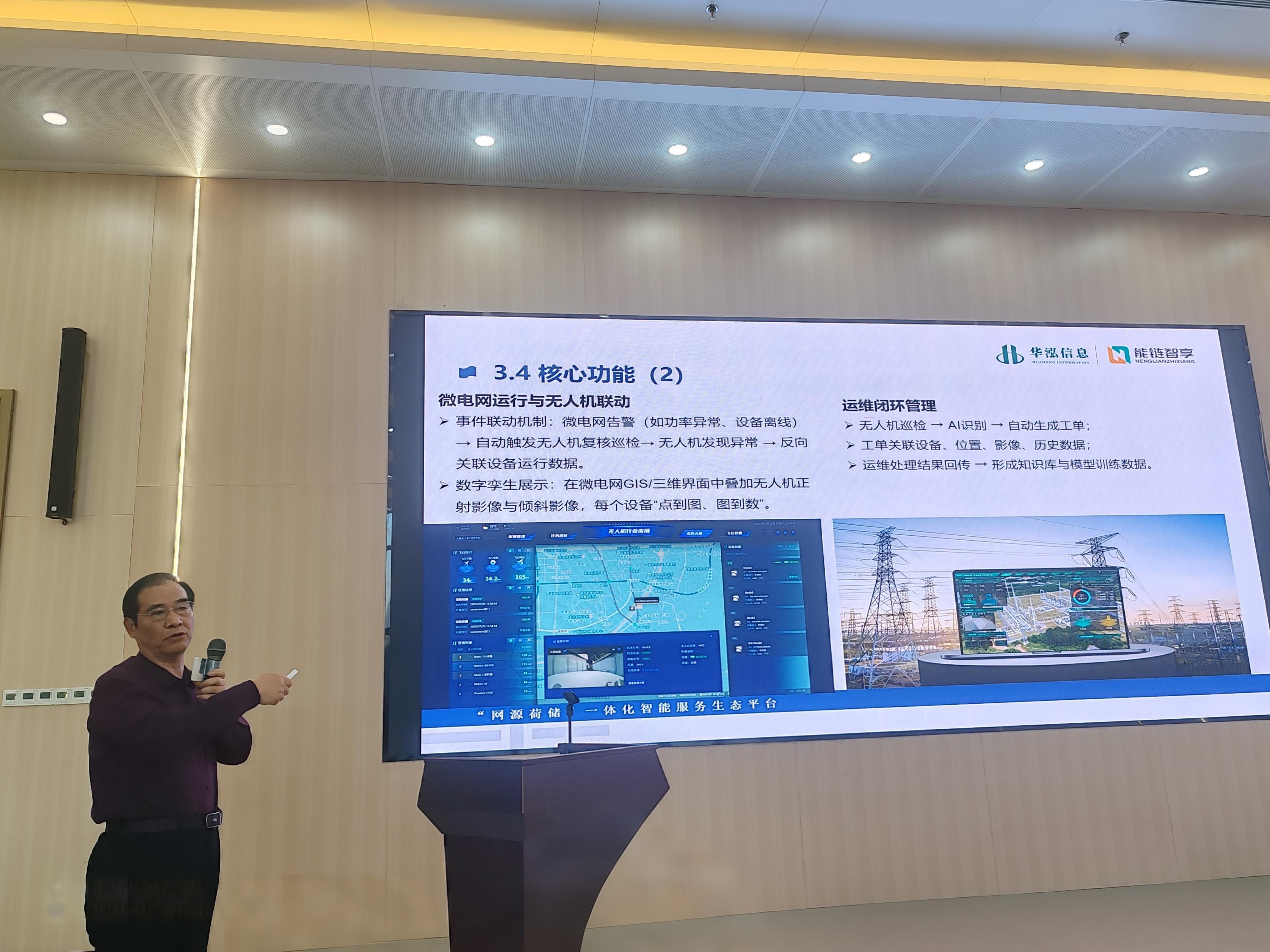 应论坛邀请,安徽能链智享集团&华泓信息董事长邱大礼在项目推介环节,作主题为《“网源荷储”一体化低空共享智能巡视的应用实践》的演讲。他系统阐述了公司基于二十年电力信息化积淀,并通过与战略合作伙伴安徽斯帕斯科技合作,创新性地将无人机系统与微电网平台深度耦合,构建“空—地—云—数”一体化智能巡检解决方案。该方案通过无人机作为“空中传感器”,实现了对光伏、储能、输变配线路等设施的自动巡检、AI缺陷识别与运维闭环管理,为低空经济在能源基础设施领域的规模化、智能化应用提供了可复制、可运营的落地范式。